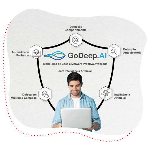 O GoDeep.AI é uma tecnologia de detecção de malware baseada em Inteligência Artificial que combina aprendizado profundo e análise comportamental. Ele memoriza ameaças conhecidas em uma nuvem centralizada, evolui em tempo real com detecção preditiva e bloqueia automaticamente qualquer atividade suspeita, garantindo proteção contra malwares inéditos e ataques Zero Day.